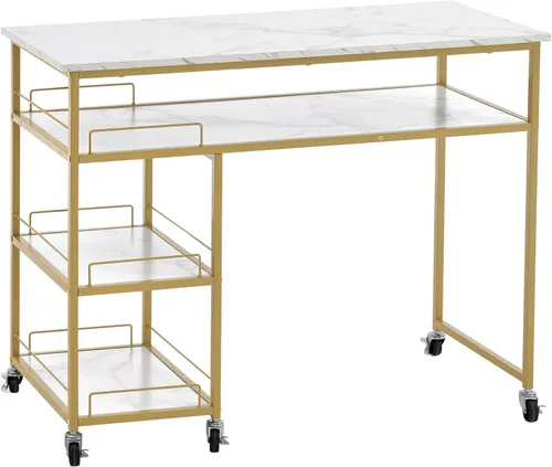 Diseño elegante y moderno: este escritorio de uñas conciso es un diseño clásico adecuado tanto para salón como para peluquería. Líneas y superficie elegantes, con patas y marco de metal pulido dorado brillante, elegante y valioso Calidad móvil y confiable: esta mesa de tocador está hecha de paneles de mármol premium, tubos de metal. Y 6 ruedas están diseñadas para girar de forma flexible, todas se pueden bloquear si es necesario. También puedes reemplazar las ruedas con pasadores de goma para aumentar la estabilidad de la mesa Gran espacio de almacenamiento: esta unidad minimalista incluye 1 escritorio espacioso, 3 estantes abiertos de almacenamiento, que es suficiente para la organización y el almacenamiento del salón. Hay suficiente espacio para cubrir la mayoría de tus necesidades y asegurarte de que puedes caber mucho Fácil de montar: este escritorio multiusos es fácil de montar. El paquete incluye herramientas de hardware, accesorios y una guía detallada con instrucciones paso a paso. Si tiene problemas de instalación, puede consultarnos y los responderemos por usted la primera vez Información del paquete: El artículo viene con un paquete y requiere autoensamblaje. Empacaremos el artículo con búfer en la caja para protegerlo de daños en el envío Funcionalidad versátil: esta mesa multifuncional sirve como estación de uñas, escritorio de manicura, estación de maquillaje o espacio de trabajo general con su amplia superficie y conveniente movilidad rodante para un fácil reposicionamiento Materiales de construcción duraderos: construido con tablero de partículas de alta calidad con revestimiento de melamina y construcción de marco de metal resistente, midiendo 43.3 pulgadas de largo, 17.7 pulgadas de ancho y 33.7 pulgadas de altura para un uso profesional duradero