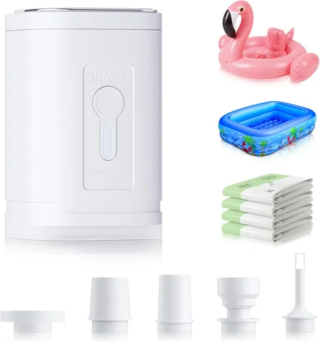 【Compacto y ligero】Tamaño pequeño (1.8 x 1.8 x 2.7 pulgadas) y solo 5.11 onzas. Cabe fácilmente en tu mochila o bolsillo con una bolsa de almacenamiento incluida para accesorios. Potente inflado/desinflado: cuenta con una presión de aire de 3.5 kPa y una velocidad de viento de 200 l/min. Infla 3-4 camas de aire o desinfla 15-16 bolsas de vacío con una sola carga. Batería recargable por USB: batería de 1200 mAh con carga rápida tipo C. Se carga completamente en horas utilizando cargadores de energía, computadoras portátiles, cargadores de automóvil o adaptadores de pared. 5 boquillas versátiles: incluye 5 boquillas para compatibilidad con la mayoría de inflables. Perfecto para flotadores de piscina, colchones de aire, tubos de nieve, pelotas de yoga y mucho más. Luz LED de campamento integrada: niveles de brillo dobles y modo intermitente SOS. Cuélgalo fácilmente en una tienda de campaña o úsalo como luz de emergencia.