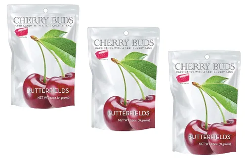 SABOR CARACTERíSTICO: ¡Nos gusta llamarlos Brotes de Cereza Cha Cha porque harán que tu lengua baile de placer! Su hermoso color rubí y sabor a cereza ácida te recordarán la tarta de cereza de mamá. Deja que iluminen tu boca como fuegos artificiales el 4 de julio. Esta es verdadera picardía de cereza. ¡Venga a bailar el Cherry Bud Cha Cha con nosotros! Sin gluten ni lácteos: Butterfields se dedica a utilizar los mejores productos del mercado. Nuestros caramelos son 100% libres de lácteos, sin gluten y elaborados con azúcar de caña pura. OPCIÓN BAJA EN CALORÍAS: ¡Cada bombón de caramelo tiene solo 12 calorías! CARAMELO ANTIGUO DE MODA: Utilizando recetas tradicionales, el caramelo Butterfields se elabora artesanalmente en calderas de cobre produciendo botones que se asemejan a gemas preciosas, cada uno con una forma y textura únicas. En Butterfields seguimos elaborando dulces de la misma manera que nuestros fundadores lo hicieron en 1924. Fabricado en Estados Unidos: propiedad y operación familiar en Carolina del Norte, Butterfields Candy fabrica y empaqueta con orgullo todos sus dulces en los Estados Unidos de América.