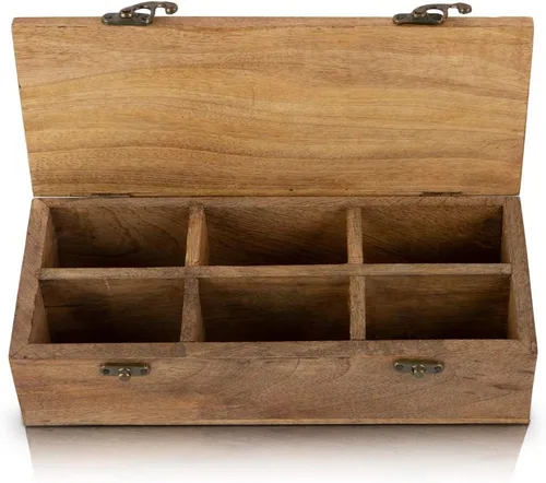 Tamaño: 11 pulgadas de largo x 4.5 pulgadas de ancho x 3 pulgadas de alto con 6 compartimentos para almacenar un surtido de té suelto como el popular desayuno inglés, manzanilla, té verde, menta marroquí, jazmín, etc. El espacio también se puede utilizar para una variedad de hierbas y especias en lugar de té Hermoso y útil: no es demasiado grande, ni demasiado pequeño, el tamaño adecuado para almacenar y organizar todo tu té favorito en un lugar conveniente. Ahorra espacio y reemplaza el embalaje de cartón con un baúl de almacenamiento de té de estilo rústico Diseño inteligente: la tapa alta con bisagras se cierra por completo mientras muestra el té maravillosamente cuando se abre para mostrarlo. Elija y elija lo que le gustaría beber o haga que sus invitados elijan entre una variedad que siempre estará convenientemente a mano, mientras se organiza y muestra en una pieza de conversación bellamente hecha a mano Hecho a mano y respetuoso con el medio ambiente: cada caja de té individual ha sido hecha a mano por artesanos utilizando herramientas simples, y décadas de experiencia ya que el conocimiento y las técnicas se han transmitido a lo largo de varias generaciones. La madera utilizada es madera de mango de alta calidad, obtenida legalmente a través de canales de distribución respaldados por el gobierno. La caja de té sirve no solo en su funcionalidad, sino también como una maravillosa decoración y añade las vibraciones adecuadas con elegancia y profundidad a cualquier área de exhibición SU COMPRA ES SEGURA: Este producto se empaqueta de forma segura desde el taller de Artesanos, y se exporta directamente a los Centros Logísticos de Amazon en los EE. UU., y se entrega utilizando los mejores socios logísticos. Tu compra también está protegida por la política de devoluciones, reembolsos y reemplazo de Amazon. Compra con confianza y añádelo a la decoración de tu hogar o regalo a alguien especial como un hermoso regalo de cumpleaños, regalo de inauguración de la casa o regalo de aniversario