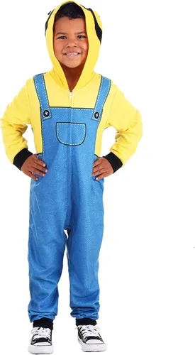 Send your little one off to sleep to dream of hanging out with Kevin and Bob in these hooded onesie pajamas for boys. They will love wearing soft pajamas featuring their favorite “Despicable Me” character. Perfect for nighttime use or lazy days of play, these sleep-and-play Minion costume pajamas will become your child’s new favorite bedtime clothes.These cozy and warm pajamas feature rich colors and fun character graphics. The convenient front zipper makes them easy to pull on and off, and the footless pants leave feet free for walking and playing. These Minion pj’s for boys are made from soft 100% polyester and provide a comfortable fit for your child. Wash them on a gentle cycle and tumble dry on low for the best results.This officially licensed Illumination merchandise is made with high-quality materials with safety and comfort in mind. To ensure maximum comfort and safety, please choose the right size for your child to avoid clothing that is too long or too loose. These pajamas are manufactured in accordance with all clothing safety standards and are flame-resistant. Let your child put on these fun jammies and live out their adventures while they sleep or play.