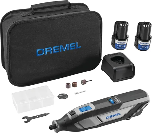 Contenido del kit: Kit de herramientas rotativas inalámbricas de 12 V con 3 bandas de lijado, 1 rueda de corte, mandril, llave, batería de 12 V, cargador y estuche de herramientas de tela. También se incluye una batería adicional de 12V 2AH. Compacto, portátil y potente: la batería de iones de litio de 12 voltios/2 AH proporciona el máximo rendimiento, alta potencia y tiempo de funcionamiento a todas las velocidades (velocidad variable: 5,000-35,000 RPM). Versátil: Capaz de realizar la más amplia gama de aplicaciones, incluyendo pero no limitado a corte, lijado y molienda/afilado. Totalmente compatible con todos los accesorios y accesorios Dremel Cambios rápidos de accesorios: la tapa de nariz patentada EZ Twist hace que los cambios de accesorios sean rápidos y fáciles sin la necesidad de una llave inglesa Batería de repuesto para que no tengas que dejar de trabajar para recargar la batería Tecnología avanzada para una duración óptima de la batería, tiempo de funcionamiento y potencia