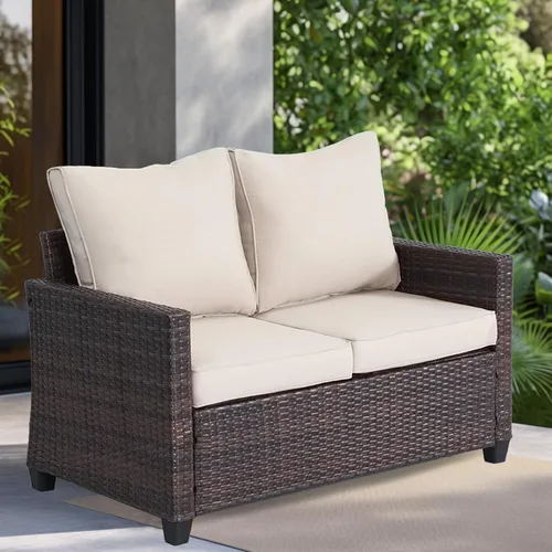 Sofá biplaza de mimbre para patio: el sofá para exteriores incluye mimbre marrón tejido a mano y cojines de sofá extraíbles. Este sofá biplaza de mimbre para exteriores está diseñado para proporcionar asientos acogedores para dos, por lo que es perfecto para relajarse en tu jardín, patio o balcón. Versátil para múltiples ocasiones: ya sea una reunión familiar, una fiesta al aire libre o una velada romántica bajo las estrellas, este sofá biplaza para exteriores añade encanto y practicidad a cualquier evento. Construcción duradera y resistente a la intemperie: construido con mimbre de polietileno premium y un marco de metal resistente al óxido, este sofá biplaza para patio soporta la lluvia y otras condiciones climáticas, asegurando un uso duradero en todas las estaciones. Perfecto para espacios modernos al aire libre: compacto y elegante, este sofá biplaza de mimbre para exteriores ahorra espacio mientras mejora la estética de su patio, balcón o área junto a la piscina. Su elegante diseño complementa la decoración moderna al aire libre sin problemas. Bajo mantenimiento y apto para mascotas: las fundas de cojín extraíbles y lavables a máquina hacen que la limpieza sea muy fácil, mientras que el mimbre resistente a los arañazos garantiza durabilidad, incluso en hogares con mascotas. Este sofá biplaza combina practicidad con estilo para un uso sin preocupaciones. Elegante sofá biplaza para exteriores: construido con ratán PE resistente a la intemperie y un marco de acero resistente, este sofá biplaza compacto para patio ofrece resistencia durante todas las estaciones para balcones, jardines o entornos de porche íntimo. Cuenta con cojines de secado rápido, resistentes a los rayos UV y un diseño que ahorra espacio, ideal para parejas que buscan asientos duraderos y románticos que combinan un mantenimiento sin esfuerzo con el encanto moderno de la casa de campo.