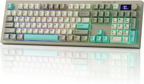 Tri-Mode Wireless for Mac/WIN: The S102 PRO gaming keyboard features mac/win compatibility (FN+A/S) and three connection modes, for dominating a late-night match on PC via 2.4Ghz wireless (FN+3), easy switching between 2 paired devices via BT (FN+1/2) or worry-free plug-and-play with the USB A-to-C cable right out of the box. NOTE: The S102 PRO keyboard is a membrane keyboard (not a mechanical keyboard). It does not support hot-swapping, and the switches cannot be replaced. Intuitive Control with Volume Knob, Display & Shortcut: Mid-game and needing a vibe change? Attending online meeting and needing to turn up volume? Simply dial up the volume with the rotary knob or use FN shortcut to cycle through RGB settings, without ever alt-tabbing or breaking your focus. The TFT screen, also an intuitive helper, let you monitor the essentials such as keyboard connection status or battery percentage in a glance. Silent Keyboard in Full Size Layout: With a dedicated number pad and full set of function keys, the S102 PRO offers the familiar spacious layout with dedicated number pad and all function keys, making office tasks and document work a breeze. With silicone structure, this membrane keyboard offers a whisper-quiet typing experience, perfect for late-night study in shared dorm or professional work in open-concept office. Creamy Keyboard with Adjustable Height: With a 2cm mid-height front designed to keep your hand in a natural, neutral position for all-day coding or gaming marathon, the S102 PRO ergonomic keyboard features the sculpted, tiered Cherry profile that mirrors the natural curve of finger movement for strain-free comfort. The adjustable kickstands, offering 3 typing angles, allows you to find the perfect incline for your specific desk height or setup. RGB Backlit Gaming Keyboard: With stunning dynamic RGB backlight, the S102 PRO gaming keyboard provides the perfect "vibe" for midnight gaming sessions. The smooth transitions and rhythmic RGB effects of S102 PRO, adjustable in brightness and colors, turns a simple desk into a professional battle station, while the gaming mode (FN+W) turns the ASDW keys into arrow keys for convenient left-hand control.