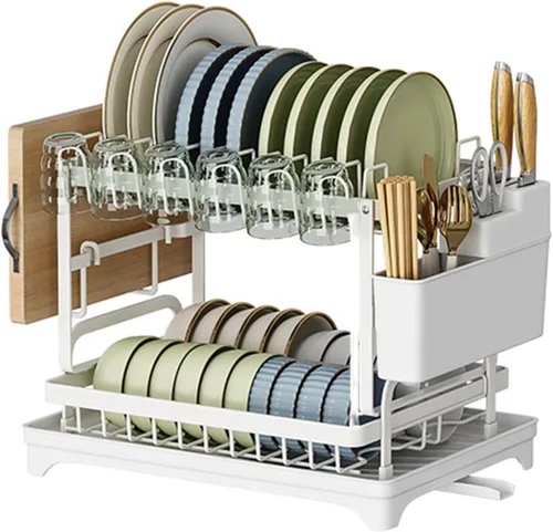 Escurridor de platos de 2 niveles, estantes de secado de platos de acero al carbono con tabla de escurrir y soporte para cubiertos y tabla de cortar