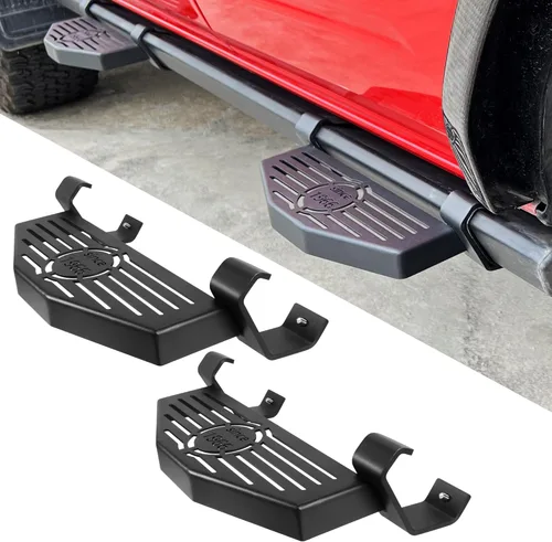 Ajuste: Estos escalones laterales están diseñados para modelos Ford Bronco 2/4 puertas 2021+ (con riel de roca OEM). Facilita la entrada y salida: te ayuda a ti o a tu familia/amigos a entrar y salir de tu Ford Bronco. La superficie de paso es de 4.8 pulgadas de ancho y 12.4 pulgadas de largo, proporcionando suficiente espacio debajo de tu pie para entrar y salir del Bronco. Construsión sólida: Estos escalones laterales ford bronco están hechos de una construcción de chapado de acero laminado en frío para una durabilidad óptima. Y los acabados de recubrimiento en polvo negro en la superficie del escalón harán un gran trabajo al resistir cualquier óxido en los próximos años. Fácil instalación: Nuestros escalones laterales están diseñados para montarse en los rieles de roca que se encuentran en los modelos Ford Bronco 2021+ con rieles de rack. La sencilla instalación atornillada tarda unos minutos y no requiere taladrar o cortar, también es fácil de desinstalar si lo necesitas para todoterreno. No tienes que quitarte todo el protector de rocas para instalar los escalones laterales. El paquete viene con almohadillas de espuma que protegen el riel de roca de daños en el acabado durante el montaje o uso. Nota: La longitud de la parte superior y la parte inferior del soporte está diseñada para sujetar fácilmente el riel de roca OEM, por lo que la parte superior y la parte inferior del soporte no se envuelven completamente alrededor del riel OEM. La parte inferior del soporte está con el tornillo de ajuste, así que no te preocupes de que la parte superior y la parte inferior del soporte sean demasiado cortas para afectar la fijación de los escalones laterales. Si el soporte puede sujetar el riel de roca OEM, estos escalones laterales son compatibles con su Bronco.