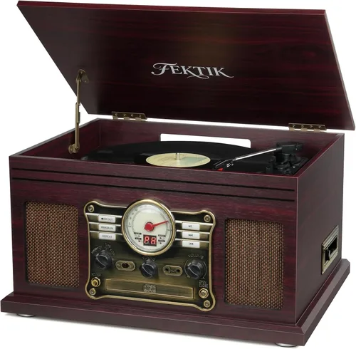 [Reproductor de discos multifuncional 10 en 1]: combina un diseño clásico vintage de caoba con características modernas, este tocadiscos reproduce tus discos de vinilo y también incluye un reproductor de CD, cubierta de cassette, radio FM, conectividad Bluetooth y conectores auxiliares y para auriculares. Función de salida Bluetooth: disponible solo en modo tocadiscos, esta función te permite transmitir audio de forma inalámbrica desde discos de vinilo a altavoces o auriculares Bluetooth. Simplemente habilite la transmisión Bluetooth, empareja con el dispositivo deseado y disfrute de sus registros en cualquier lugar. Función de entrada Bluetooth: transmite música de forma inalámbrica desde tu teléfono inteligente, tableta u otro dispositivo habilitado para Bluetooth directamente al reproductor de grabaciones. Simplemente habilita el modo Bluetooth, empareja tu dispositivo y disfruta de tus canciones favoritas a través de los altavoces integrados. Tocadiscos de tres velocidades de tracción por correa de tres tamaños: este tocadiscos soporta 3 velocidades (33 1/3, 45 y 78 RPM), tres tamaños (vinilo de 7 pulgadas/10 pulgadas/12 pulgadas) y ofrece un sonido estéreo de alta calidad con una vibración mínima. Ideal para tu sala de estar, dormitorio u oficina, es una opción perfecta para los entusiastas del vinilo. Consejo: Al colocar un disco de 12 pulgadas, inclínelo suavemente hacia el brazo para una reproducción suave. Todos los controles que necesitas: este tocadiscos está equipado con un conjunto completo de controles intuitivos, incluyendo una perilla de volumen, botón de grabación/eliminación, botón de parada, sintonizador de radio FM, interruptor de modo, botón de entrada y salida de CD y botones de fácil clic para selección de entrada, potencia, reproducción/pausa, adelante/rebobinado, expulsar, programar, barajar y repetir funciones.