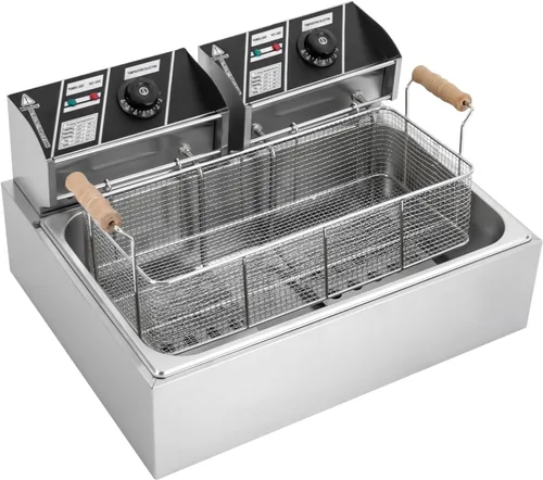 Especificación Material: acero inoxidable 201, plástico, caucho, baquelita Proceso: WireDrawing Color: plateado. Estilo: moderno. Forma: rectangular. Requiere montaje: sí. Tipo de montaje: sobremesa. Tipo de alimentación: con cable eléctrico. Tipo de enchufe: estándar de EE.UU. Voltaje: 110 V. Potencia: 1.7KW+1.7KW Rango de temperatura: 140.0-392.0 °F/140-392℉ Capacidad: 6L+6L/1.59gal+1.59gal Tamaño del producto: 55*43*29cm/21.65*16.93*11.42in Tamaño del paquete: 24.41 x 19.69 x 14.96 pulgadas. Peso bruto: 17.64 libras. Paquete incluido. 1 freidora eléctrica comercial. 2 tableros de partición de residuos. 2 cestas pequeñas. 1 cesta grande. 1 clip para alimentos. 4 esponjas de limpieza. 1 manual en inglés. OtroNecesarioAccesorios
