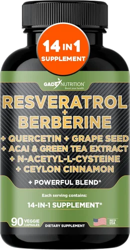 Gade Nutrition Resveratrol Berberina Quercetina Extracto de semilla de uva Extracto de té verde N-acetil cisteína - Suplemento complejo 14 en 1 para