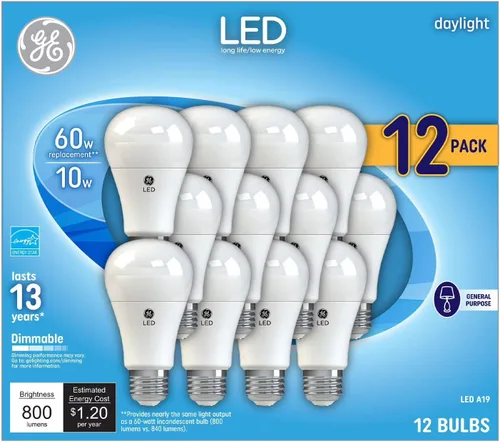 Reemplazo de 60 vatios utilizando solo 10 vatios (800 lúmenes) Clasificado para durar 13 años basado en 3 horas de uso al día Luz fresca y azulada con temperatura de color de 5000 Kelvin Con certificación Energy Star Forma de la bombilla A19