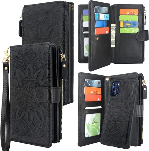 Harryshell Funda de piel con cremallera magnética desmontable y bolsillo para monedas, 12 ranuras para tarjetas, correa de muñeca para Motorola Moto