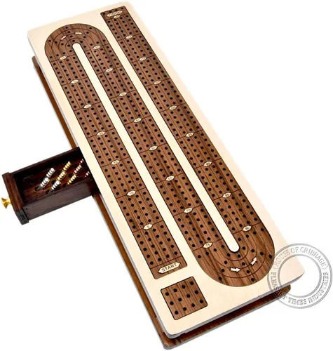 House of Cribbage presenta 4 pistas (120 puntos) Tabla de Cribbage Continuous hecha para hasta 4 jugadores. El tablero/caja mide 13.5 x 4.7 x 2 pulgadas (13.5 in x 4.7 in x 2.0 in) y se puede utilizar para jugar juegos entre un par de jugadores, un trío o cuatro jugadores juntos. Puedes almacenar dos barajas de cartas en dos secciones de almacenamiento separadas cerradas por tapas deslizantes y cada sección puede almacenar una baraja de cartas de póquer o puente. El cierre magnético en la parte posterior de cada tapa deslizante sujeta la tapa firmemente cuando está en posición cerrada. El centro de la caja tiene un mini cajón muy hermoso para almacenar doce clavijas de metal para cuna. Hay 12 ranuras en el cajón y cada ranura puede almacenar una clavija. La cerradura magnética en la parte posterior del cajón sujeta firmemente el cajón cuando está en posición cerrada. El cajón extraíble tiene un pomo de latón especialmente diseñado para un agarre fuerte. La tabla/caja completa tiene tres capas de laca catalizada en acabado satinado que proporciona protección contra derrames y desgaste general. Se proporcionan doce clavijas de cuna de latón (3 doradas, 3 plateadas, 3 de cobre y 3 plateadas) con el tablero. La tabla de cuna hecha a mano ha sido incrustada en madera de teca y madera de arce. La parte inferior de la caja tiene una almohadilla de fieltro de terciopelo granate que protege la caja de arañazos y mejora la estabilidad de la tabla. También se proporciona una bolsa de terciopelo con cordón para proteger la tabla. No utilizamos ninguna serigrafía o pinturas para crear números o pistas en el tablero de cribbage. Diseñado y fabricado por Pleasant Times Industries. Todos los diseños, imágenes, conceptos y contenido son propiedad de Pleasant Times Industries. Nota: las cartas de juego no están incluidas junto con la tabla de cunas