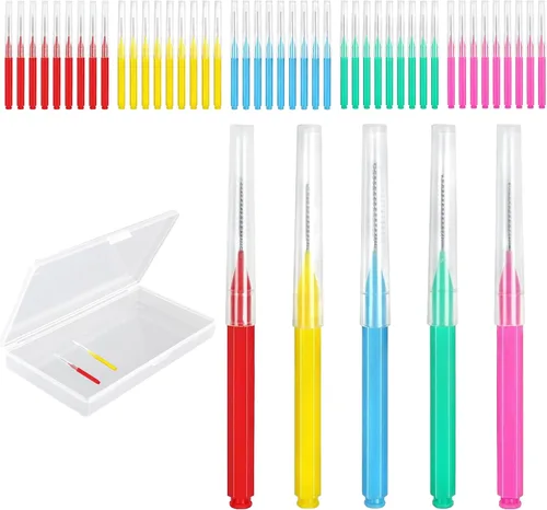 Esos irrigadores dentales para aparatos ortopédicos son fáciles de operar y limpian las áreas tortuosas de la boca. Te ayudan a eliminar de manera efectiva y completa los restos de comida de tus dientes, y previenen el aliento nublado que causa y la enfermedad periodontal. Los cepillos dentales entre dientes son herramientas prácticas para mantener tus dientes limpios en la vida diaria. Características del producto ✿Guía de uso: mantén el cepillo de hilo dental horizontalmente contra la superficie de tus dientes, luego muévelo hacia adelante y hacia atrás desde el interior hacia el exterior, limpia profundamente cada hendidura entre los dientes. ✿Alta calidad: estos hilos dentales de ortodoncia están hechos principalmente de plástico, no se rompen ni doblan fácilmente. Pueden ayudarlo a mantener los dientes limpios y puede tirarlos después de su uso. ✿Elección ideal: este juego de pinceles interproximales tiene 5 colores vivos, incluyendo rojo, amarillo, azul, verde y rosa. Es una opción ideal para limpiar los dientes, adecuada para uso personal y familiar. Especificación Material: plástico Color: rojo, amarillo, azul, verde, rosa Tamaño: Cepillos: 2.83 pulgadas/2.8 in, cabeza del cepillo: 0.91 pulgadas/0.9 in Estuche de almacenamiento: 4.25 x 2.87 x 0.71 pulgadas/4.3 x 2.9 x 0.7 in Contenido del paquete: 50 cepillos interdentales.