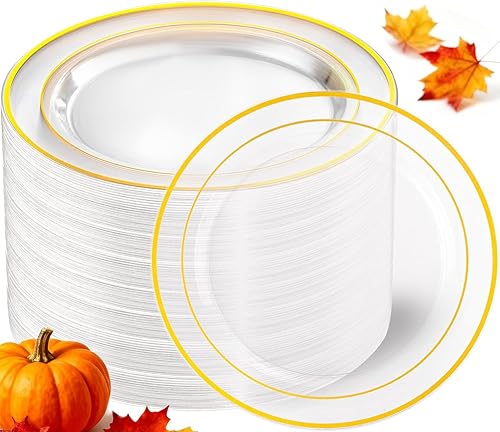 I00000 60PCS Clear Gold Dessert Plates, Clear Plastic Plates with Gold Rim 7 Inch, Fancy Disposable Wedding Plate Heavy Duty for Thanksgiving