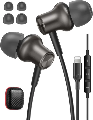 Auriculares con cable para Apple: para conector Lightning compatible con iPhone 14, 14 Plus, 14 Pro, 14 Pro Max, para Apple iPhone 13, 13 Mini, 13 Pro, 13 Pro Max, para iPhone 12, 12 Mini, 12 Pro, 12 Pro Max, para iPhone 11, 11 Pro, 11 Pro Max, para iPhone X, XS, XS Max, para iPhone XR, para iPhone iPhone 8 7, 8 7 Plus, para iPhone SE, SE2 (2ª generación), SE3 (3ª generación), para iPad o para iPod touch para puerto Lightning Certificado MFI para audífonos Lightning: certificado oficialmente MFi para auriculares con cable Lightning con todos los dispositivos de teléfonos celulares iOS; sin ventanas emergentes o conexión Bluetooth o conectores adicionales; chip potente integrado para mantener alta resolución, sin zumbidos, estallidos o cualquier problema de audio malo, lo que te permite disfrutar de una experiencia musical increíble y la experiencia auditiva general de sonido estéreo HiFi de graves profundos AURICULARES MAGNÉTICOS PARA IPHONE: Cada auricular tiene un imán debajo de la carcasa y es conveniente para fijar magnéticamente, por lo que puede usarlos alrededor de su cuello cuando no estén en uso y alcanzarlos directamente sin enredos Control remoto de función completa y micrófono de llamada claro: el controlador de línea puede despertar Siri, control de volumen, reproducir/pausar canciones, saltar la canción siguiente/anterior, responder y colgar llamadas sin levantar tu teléfono; el micrófono de alta calidad proporciona llamadas nítidas que pueden soportar llamadas con manos libres, lo que te permite responder fácilmente y finalizar llamadas Comodidad en los auriculares: un diseño ergonómico con tres tamaños de almohadillas de silicona ultrasuave (S/M/L) garantiza el mejor ajuste para orejas pequeñas en niños, mujeres y niñas, y viene con una bolsa de transporte portátil para auriculares y clip para auriculares para un uso cómodo a largo plazo Fiabilidad cableada: sin carga, sin deserciones. Nunca te preocupes por la duración de la batería o las desconexiones Bluetooth. Enchufa y disfruta de un sonido continuo y de alta calidad para el trabajo, viajes o entrenamientos, sin necesidad de carga Funda protectora portátil incluida: mantén tus auriculares seguros y organizados en la funda compacta incluida. Perfecto para tirar en tu bolsa, mantener los cables ordenados y proteger tu inversión Cable listo para usar sin enredos: deja de luchar con nudos. El cable flexible resiste enredos, por lo que tus auriculares para Apple iPhone 14 13 12 siempre están listos cuando lo estés, no necesita desenrollar