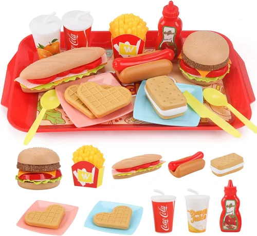 Juego de comida de juego de simulación para niños, juego de comida rápida extraíble con bandeja, combo de hamburguesas, papas fritas, accesorios de