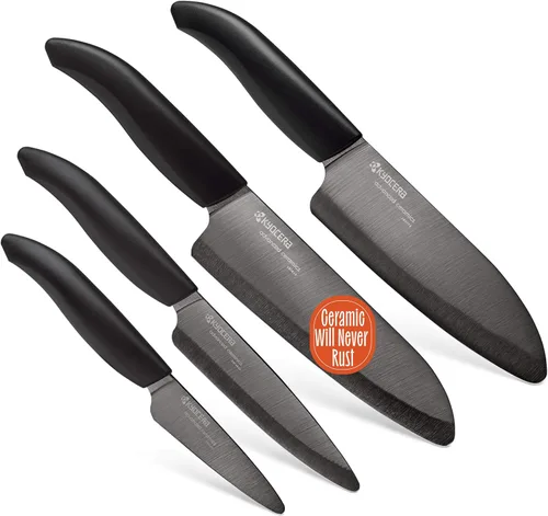 Compañero culinario: Explora el mundo de los cuchillos de cerámica Kyocera con el juego de cuchillos de cerámica Revolution de 4 piezas, diseñado para cocineros que buscan un valor y un rendimiento excepcionales en la cocina. Cuchillas patentadas afiladas a mano: hechas de material de circonia de Kyocera, nuestras cuchillas de cuchillos japoneses ofrecen una calidad y rendimiento superiores. Con una durabilidad excepcional, duran hasta 10 veces más que las cuchillas tradicionales. Imprescindible para tu cocina. Cuchillo de chef ligero: Disfruta de la comodidad de los cuchillos ligeros que ofrecen un manejo y limpieza sin esfuerzo. El material cerámico no reactivo evita la oxidación, preservando la frescura de tus ingredientes para una cocina sabrosa y saludable. Versátil y confiable: desde cortar frutas y verduras hasta manejar carnes deshuesadas, estos cuchillos sobresalen en varias tareas de cocina. Tenga en cuenta que no son adecuados para alimentos duros o congelados, lo que garantiza un rendimiento y una durabilidad óptimos. Juego completo: Desata tu potencial culinario con el cuchillo de chef Santoku de 6", cuchillo Santoku de 5.5", cuchillo utilitario de 4.5" y cuchillo de pelar de 3" incluidos en este juego. Reemplaza tus utensilios de cocina con estos cuchillos y emprende un viaje culinario con confianza.