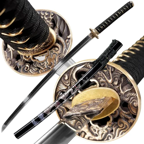 Los accesorios de este producto están hechos de (material de cobre puro), por lo que es robusto y fuerte. No hay que preocuparse de que se decolore u oxide. Los mangos del cuchillo están hechos de madera, envueltos por cables de algodón antideslizantes y absorbentes de sudor. La vaina también es de madera, con patrones que hacen que el producto sea más hermoso. La hoja está fabricada con acero T10 con templado de arcilla, un proceso que le da una dureza y resistencia excepcionales. Nuestras espadas militares se forjan utilizando métodos tradicionales, con cada paso—desde la selección de materiales, la forja y el temple hasta el pulido y afilado—hecho completamente a mano. Son capaces de cortar fácilmente bambú, esterillas de paja, botellas de plástico, frutas y materiales similares. Lo que necesitas hacer es limpiarlo con un paño o un pañuelo. En el uso diario, también debes prestar atención al mantenimiento del producto. Intenta no tocar el agua. Una vez que toque el agua, debe limpiar el agua. Evite la humedad residual en la hoja. Tenga cuidado, no la coloque en un lugar húmedo y a la luz solar directa. Tamaño: 40.55 pulgadas de largo total, 10.24 pulgadas de largo del mango, 27.95 pulgadas de largo de la hoja, 1.18 pulgadas de ancho de la hoja, 0.27 pulgadas de grosor de la hoja, peso: 2.75 libras. Dureza: 56 HRC