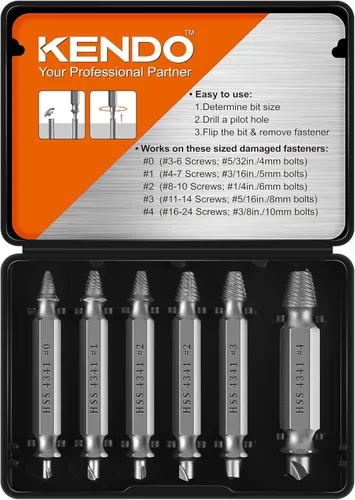 APLICA A TODOS LOS TALADROS - Este juego de extractores de tornillos de 6 piezas (#0, #1, #2, #2, #3, #4) es compatible con taladros, tornillos y pernos (3-12mm) de cualquier tamaño. Este kit de extractor de pernos está diseñado para perforar y eliminar los tornillos y pernos más difíciles, pelados, dañados, incrustados, oxidados o pintados. CALIDAD DE GRADO INDUSTRIAL - La herramienta de extracción de tornillos pelados KENDO está hecha de Acero de Alta Velocidad HSS 4341, que tiene una dureza de 63 HRC. El material es más duradero que la mayoría de los extractores de tornillos en el mercado, y la dureza y durabilidad son mejores que otros. Fácil de usar: solo dos sencillos pasos para hacer el trabajo. 1: Cree un agujero más profundo en el tornillo o perno dañado utilizando la cabeza del extractor de tornillos. 2: Convierta la cabeza del removedor de tornillos a la cabeza del extractor de tornillos y saque el tornillo o perno roto. INCLUYE UNA FUNDA DURADERA - El juego de extractores de tornillos KENDO es compatible con taladros eléctricos y viene con una funda duradera, manteniendo todas las puntas de extractor agradables y ordenadas. Regalo increíble para hombres y mujeres - Herramientas increíbles y únicas para hombres y mujeres.