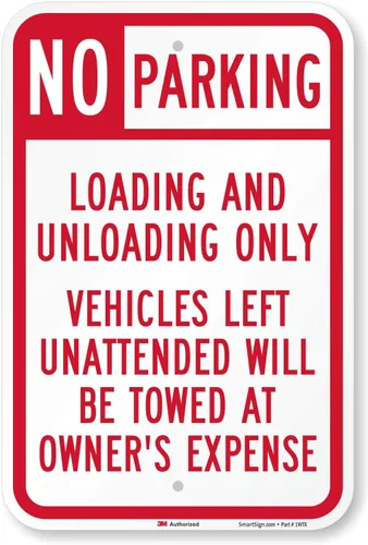 Autorizado por 3M. Las señales utilizan una película reflectante de alta intensidad de grado 3M montada en aluminio de 63 mil de espesor. Esto asegura que las señales son duraderas en el exterior. DURABILIDAD. Durabilidad de 10 años respaldada por una garantía 3M y aluminio inoxidable. Esquinas redondeadas. Los letreros tienen esquinas redondeadas y esquinas sin rebabas para un manejo seguro, una vida útil más larga y una apariencia profesional. LAMINADO. Los gráficos están protegidos contra el clima y el abuso. El graffiti se puede limpiar. Las señales laminadas duran más que los signos competitivos no laminados o recubiertos con sobrerevestimiento. INSTALACIÓN. Todos los letreros vienen con agujeros de montaje preperforados y pre-despejados para una fácil instalación. Los letreros se montan en postes de canal en U, postes galvanizados cuadrados o redondos, postes de madera y cercas de eslabones de cadena. No hay estacionamiento. Convery su carga y descarga solamente, vehículos desatendidos remolcados advertencia con esta señal de no estacionamiento.