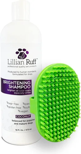 Unrivaled Brightening Formula: Say goodbye to dull fur with our Coconut Brightening pet shampoo. Perfect for short to long coats, its unique formula produces a rich lather that rinses off effortlessly, brightening whites and enhancing coat colors. Unlike other whitening shampoos, Lillian Ruff Brightening Shampoo is suitable for all coat colors, ensuring a vibrant and refreshed look every time. Calm & Relax: Indulge your dog with the pampering they deserve using our Brightening Shampoo, infused with natural coconut extracts. Turn every bath into a serene spa session, gently soothing your pet while effectively cleansing and brightening all coat colors. Delight in the calming coconut aroma that lingers, ensuring your pet emerges feeling refreshed and relaxed after every wash Less is More: With its concentrated violet pigments, a little goes a long way, Experience nourishing softness and ultimate whitening with minimal product usage, saving you time and money while ensuring your pet receives the best care. Made in the USA: Proudly manufactured in the USA to the highest standards, our formula is pH-balanced, gluten-free, sulfate-free, paraben-free, cruelty-free, and vegan A Brand Used by Professionals – Lillian Ruff serves professional vets and groomers all over the world thanks to our gentle formula and quality ingredients. Everything at Lillian Ruff is produced to human standards and formulated for Pets.