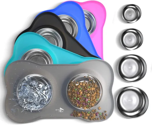Active Pets - Juego de tazones para perros, tazones para comida y agua de acero inoxidable a prueba de derrames con alfombrilla de silicona