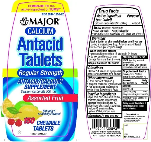 Major Los antiácidos de calcio farmacéuticos 500mg son comparables a los Tums y proporcionan alivio de problemas estomacales comunes. Elaboradas con 500 mg de carbonato de calcio, estas tabletas son masticables y vienen en sabores mixtos de frutas. Para un alivio instantáneo de tu malestar estomacal debido a la acidez estomacal, la indigestión ácida y el estómago agrio, prueba el sabor principal surtido de 500 mg. Tabletas antiácidos de calcio. Cada tableta es masticable para tragar fácilmente y viene en sabores variados de frutas de gran sabor. Hay un sabor para todos en esta botella de antiácidos: simplemente elige tu favorito, mastica y espera a que el alivio comience.