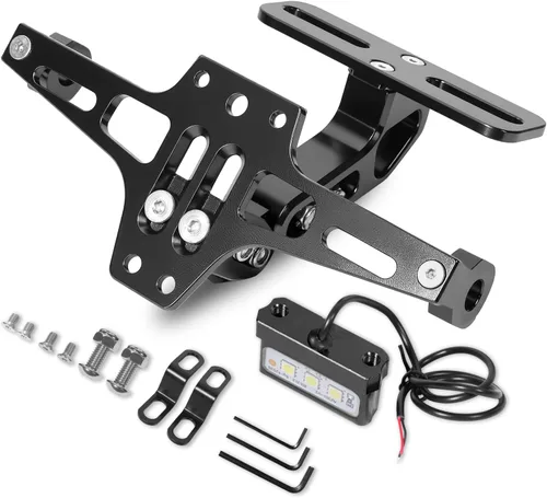 AJUSTE: El eliminador de guardabarros con el espaciador de extensión puede ser adecuado para la mayoría de los modelos. Pero no compatible con 2015 CBR300R, CBR600RR, CBR500R, CB500F, Monkey, 2011-actual GSXR 600, 2011-actual GSXR 750, 2022 GSXS, 2013-2019 Ninja 300, 2021 Ninja 400, 2021 Ninja ZX6R, Z900, 2012 2018 YZF-R1, 2020 YZF-R6, 2019 Xmax, MT-03. Por favor, comprueba la imagen de la dimensión del soporte de la matrícula antes de comprar EXTENDIBLE: El rango del agujero de montaje es de 30 a 210 mm. El espaciador de extensión incluido permite que los orificios de montaje se extiendan a 210 mm, lo que se puede utilizar para una gama más amplia de modelos Ajustable: Plegable de 90 grados para el ajuste, la posición de instalación del eliminador de guardabarros universal de motocicleta se puede mover hacia arriba y hacia abajo, puede elegir una posición de instalación adecuada para adaptarse a los diferentes tamaños de placas de matrícula MATERIAL: Hecho de aleación de aluminio 6063-T6, con tratamiento de superficie de aluminio anodizado de alta calidad, el eliminador de guardabarros de motocicleta no se corroe ni se oxida fácilmente por objetos extraños EL PAQUETE INCLUYE: Un soporte para matrícula de motocicleta, dos tornillos de montaje, tres herramientas de instalación y una luz LED para matrícula