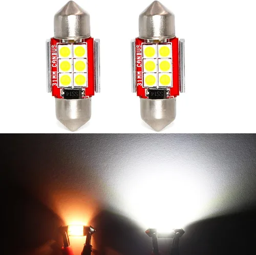 Pack de 2: Longitud: 31 mm; Color: 6000 K xenón blanco; Voltaje de funcionamiento: 10 V~30 V (compatible con vehículos de 12 V/24 V); Corriente: 0,15 A; Potencia: 1,8 W/foco; 500 lm/foco, cada foco LED DE3175 equipado con 6 piezas de chips LED de alta potencia 3030 Características: sin polaridad, controlador IC de corriente constante inteligente integrado para un rendimiento de calidad, disipador de calor de aluminio para una excelente disipación del calor, bajo consumo de energía, vida útil más larga Amplia aplicación: utilizada para reemplazar la luz de cúpula OEM de3175 de 31mm, luz de mapa, luz de maletero o zona de carga, luz de puerta interior, luz de matrícula, luz de compartimento de equipaje, luz de lectura, luz de paso, luz de guantera, luz de paso/cortesía, luz de espejo de tocador, etc. Tamaños de bombilla compatibles: DE3175, DE3021, DE3022, DE3023, 3021, 3022, 3175, 6428, 6430, 7065, etc. Fácil de instalar, diseño libre de errores Canbus, para el 99% de los vehículos, simplemente conecta y opera Garantía: UN AÑO de garantía. Por favor, verifica el manual del propietario o el tamaño del foco antes de comprar, ya que el sistema de ajuste de Amazon puede no ser 100% preciso