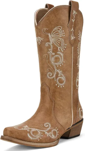 Rollda Botas vaqueras para mujer, botas vaqueras bordadas a media pantorrilla, botas occidentales para mujer, botas desgastadas con pestañas para