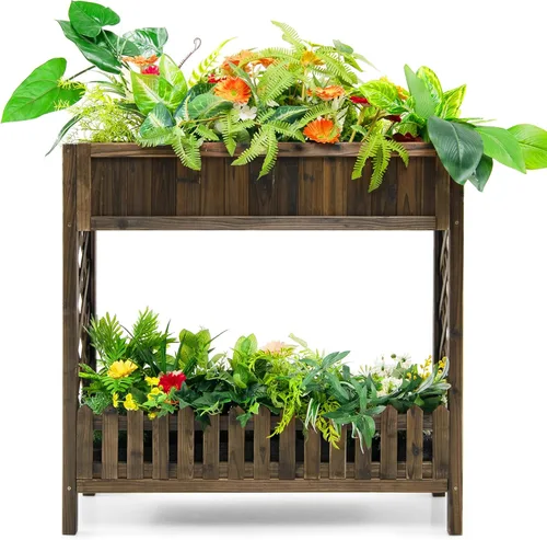 S AFSTAR Cama de jardín elevada de 2 niveles, cama de flores para interiores y exteriores con valla de estante inferior, caja elevada de madera