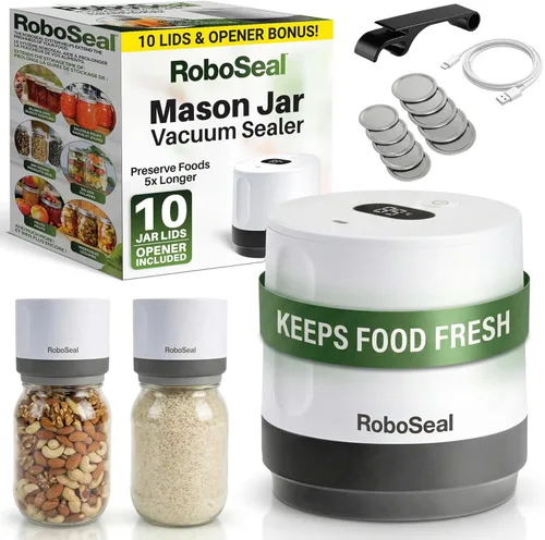 Sellador al vacío recargable RoboSeal para tarros Mason de boca ancha y regular, operación con un toque, incluye 10 tapas de tarro y abretarro,