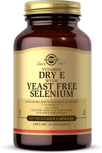 SOLGAR Vitamina E seca con selenio sin levadura, 100 cápsulas vegetales, soporte antioxidante avanzado, sin OMG, vegano, sin gluten, sin lácteos,