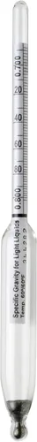 Mide la gravedad específica/densidad relativa (g/cm) de líquidos más ligeros que el agua Comúnmente utilizado en industrias como alimentos y bebidas, química, farmacología, transporte, refrigeración Serializado individualmente; lastre y vidrio sin plomo Longitud: 165mm (6.5"); Rango: 0.890/1.000; Divisiones: 0.002; Precisión: ±0.002 Empaquetado con una declaración de precisión en varios idiomas (inglés, francés, alemán, italiano, portugués y español) que indica precisión rastreable a NIST; Antiguo HB # 50505