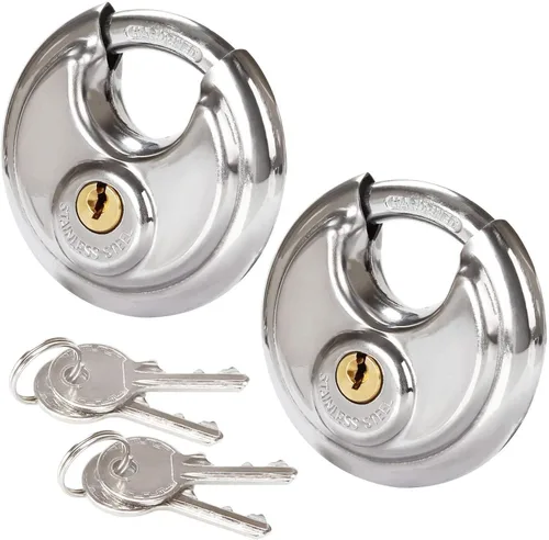 STARVASY - 2 candados de disco con llave, anti-pico, anticorte, libre de óxido, acero inoxidable resistente con grillete de 3/8 pulgadas, 2-3/4 pulgadas. Large ● Un candado redondo fuerte que la mayoría de las unidades de almacenamiento aprueban ● Llave igual con función de retención de llave que garantiza que el candado no se deje desbloqueado ● Resistencia al corte de 4,000 libras, resistencia a palanca de 3,500 libras ● 5 pines x 5 pasos mecanismo de vaso de pin de alta precisión ● Es lo suficientemente pequeño para guardar en su bolsa de herramientas cuando no sea necesario Nota: Si siente el grillete y los mecanismos internos un poco rígidos, por favor ponga un poco de lubricante para que funcione sin problemas. Especificaciones: Ancho del cuerpo: 2-3/4 pulgadas (2.756 in) Diámetro del grillete: 3/8 pulgadas (0.374 in) Material: acero inoxidable y acero endurecido El paquete incluye: 2 candados redondos de disco. 4 llaves (2 llaves diferentes)