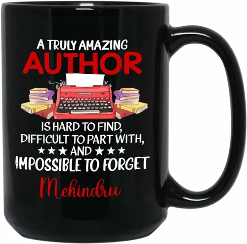 Taza negra con texto en inglés "A Truly Amazing Author Is Hard To Find.