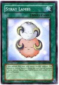 Yu-Gi-Oh! es un juego estratégico de cartas intercambiables en dos jugadores en duelo usando una variedad de cartas de monstruo, hechizo y trampa para derrotar a los monstruos de su oponente y ser el primero en dejar caer los puntos de vida del otro a 0. Nombre de la tarjeta: Stray Lambs Tipo de carta: hechizo normal Número de tarjeta: CP02-EN020 Conjunto: Paquete Campeón: Juego 2 Atributo: Hechizo Código de acceso: 60764581 Texto de la carta: si activas esta carta, no puedes Invocar de forma normal, Invocar con Voltear o Invocar de Modo Especial durante este turno. Invoca de Modo Especial 2 'Fichas de Cordero' (Tipo Bestia/TIERRA/Nivel 1/ATK 0/DEF 0) en Posición de Defensa.