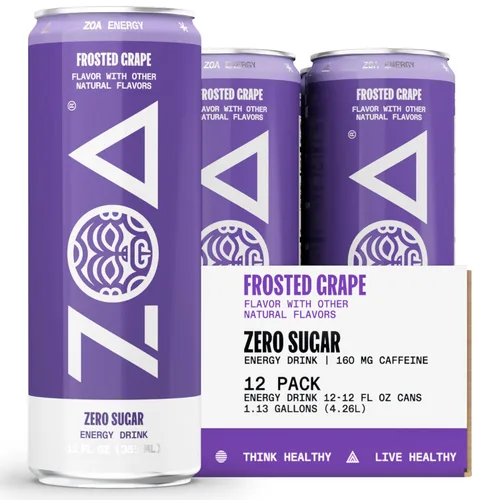ZOA Bebidas energéticas Zero Sugar, uva esmerilada, sin azúcar con electrolitos, vitamina C saludable, aminoácidos, vitaminas B esenciales y cafeína