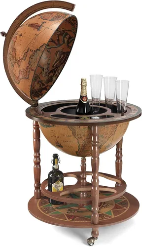 El Morientez Globe Bar es un armario de 19.7 in de globo que puede almacenar hasta 4 botellas y 12 vasos en su bola de globo antigua réplica del siglo XVII de 20 pulgadas. Las patas están hechas a mano con madera maciza con una mancha castaña. Ya sea para impresionar a sus invitados o como un mueble general, este impresionante globo de bebidas seguramente traerá estilo a cualquier entorno. Los globos de barra de 19.7 in pueden contener casi cualquier tamaño de botella de bebidas, lo que los hace muy deseables. Cartografía Una reproducción de un mapa del siglo XVII Mapa diseñado por Pierre Duval, un cartógrafo francés que trabajó para el rey francés Luis XIV. Se desconoce la fecha exacta, pero está entre 1647 y 1683. Detalle del mapa Una sensación vintage del mapeo del mundo antiguo del siglo XVII. Texto dibujado a mano en latín añadiendo a la sensación clásica del mundo. Ilustraciones de barcos del siglo XVII en los océanos. Ilustraciones de vida silvestre incluyendo osos y elefantes. Ilustraciones de edificios que incluyen las pirámides y las principales ciudades de la época. Requiere montaje. Nota: no se suministran vasos ni botellas.